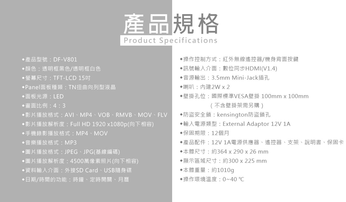 Home / 電子數位相框 / 12-17吋數位相框 / 面板相框 / DF-V801_TW