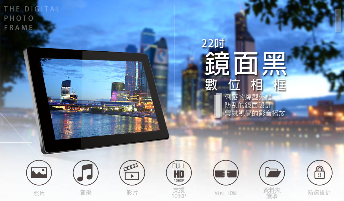 逸奇VM22 22吋耐磨抗刮黑色鏡面數位相框