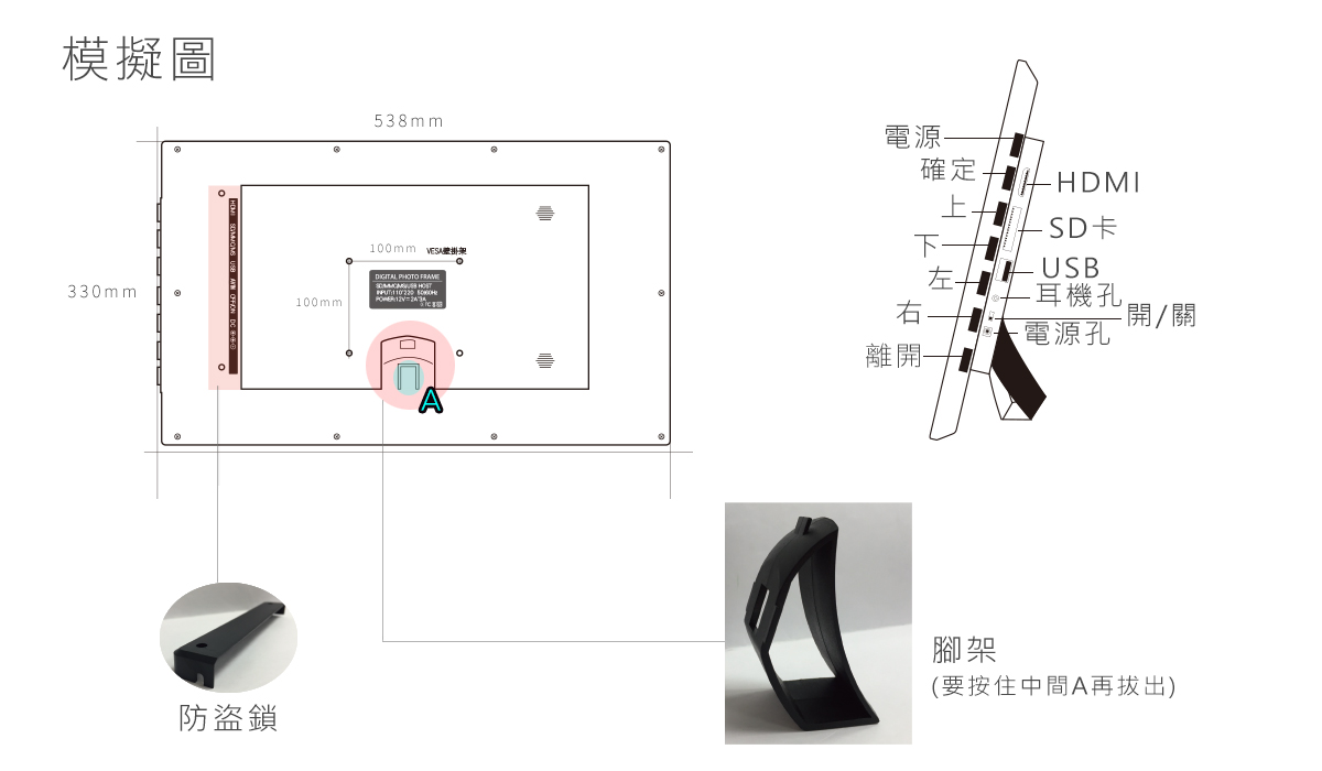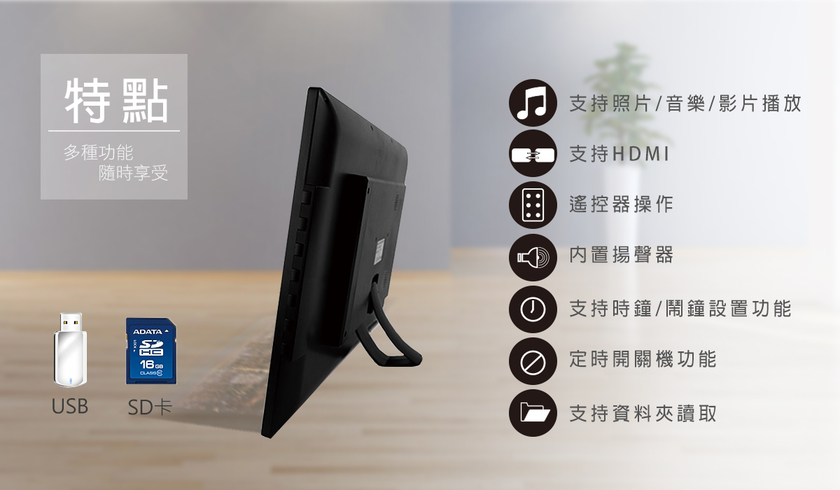 - 支援SD卡∕USB讀取,數位相框可壁掛