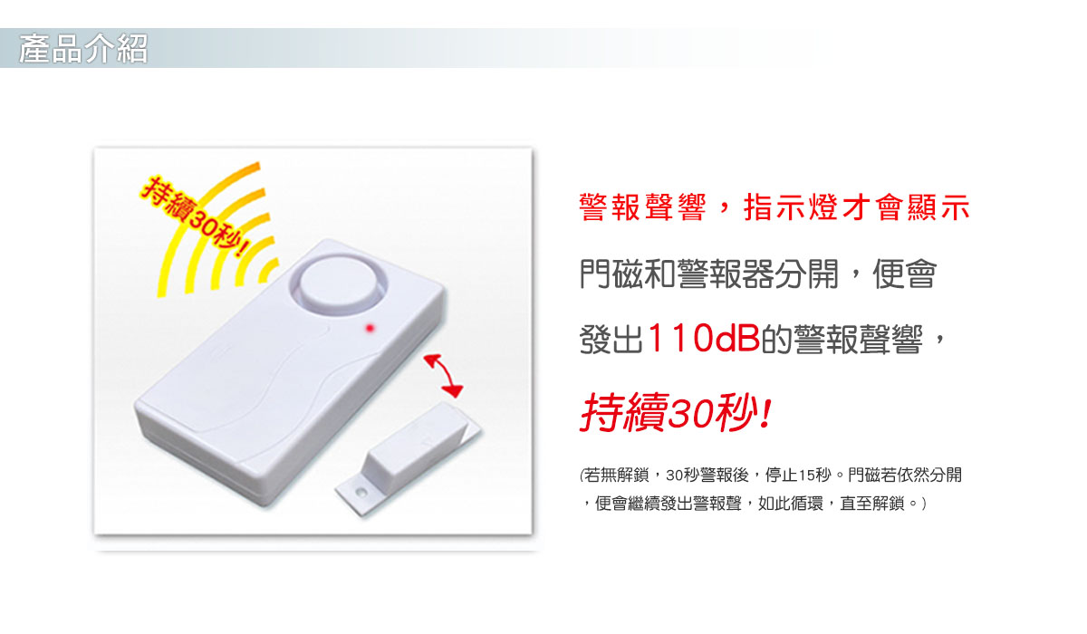 30秒結束後,停止15秒,門磁若依然分開,則警報30秒,如此循環,直到解鎖為止