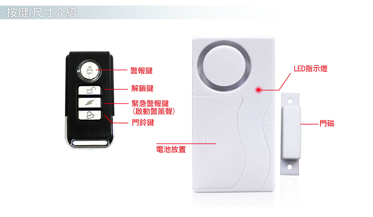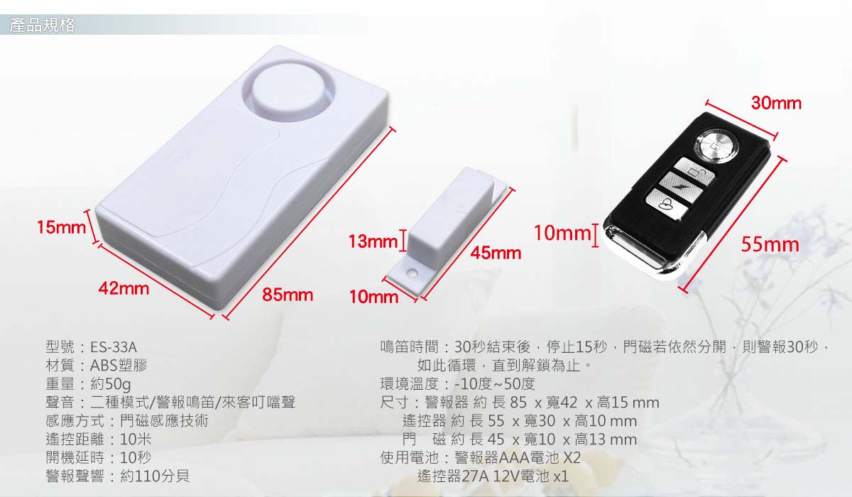 警報器AAA電池x2、遙控器27A 12V電池x1