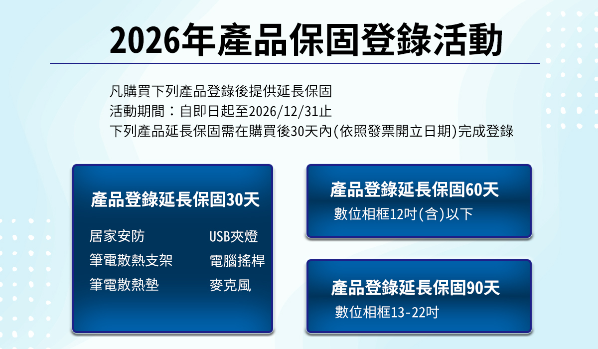 2026/1/2 產品保固登錄活動即日起至2026年12月31日止,購買指定商品,上網完成保固登陸(填寫表單連結),即享延長保固。 2025/1/2 產品保固登錄活動即日起至2025年12月31日止,購買指定商品,上網完成保固登陸(填寫表單連結),即享延長保固。 2024/9/13 產品保固登錄活動即日起至2024年12月31日止,購買指定商品,上網完成保固登陸(填寫表單連結),即享延長保固。